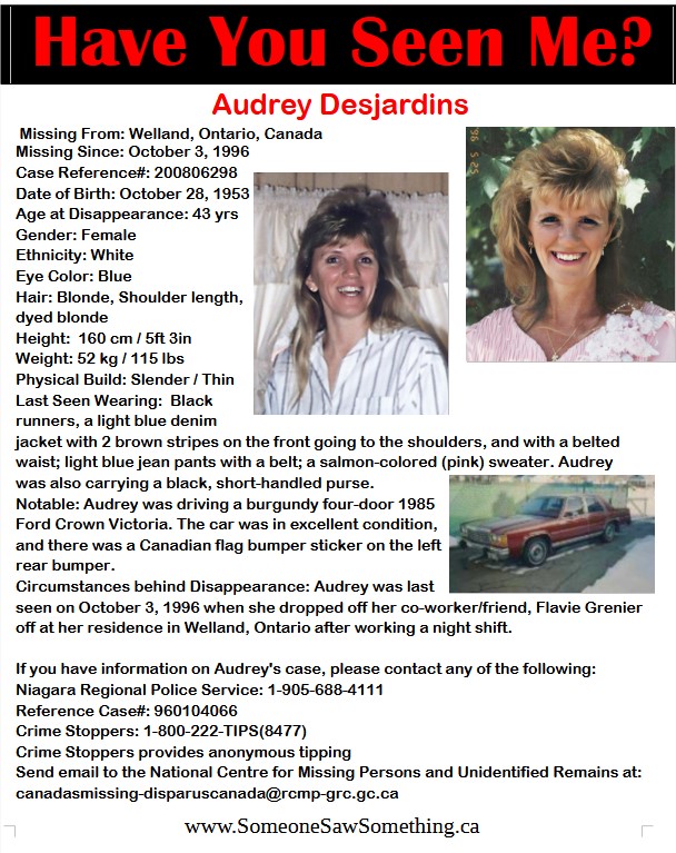 Have You Seen Audrey Desjardins? Share this Share on Facebook (Opens in new window) Facebook Share on X (Opens in new window) X More Share on Tumblr (Opens in new window) Tumblr Share on Pinterest (Opens in new window) Pinterest Like Loading... Related Leave a comment Cancel reply Δ