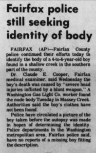 On June 13, 1972, a 14-year-old boy was pushing his bicycle to a nearby gas station on a country road to put air in his tire when he came across the body of a brutally beaten little boy in a creek. More than 50 years later, police have no identity for this dead child nor have they found his killer. But their search continues. “There is always hope,” Fairfax County police Officer Shelley Broderick said. Police have taken DNA samples and placed them in the FBI’s National Missing Person DNA Database, and recently produced a lifelike photo of the boy in the hopes that someone will recognize his face and come forward with information that could help solve this case. The child was found in Massey Creek on Old Colchester Road just off of Interstate 95 and not far from Fort Belvoir.