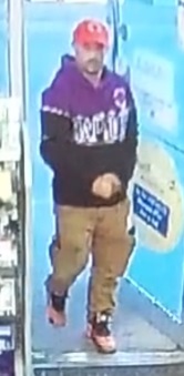 Michal was last seen wearing: A red baseball cap, a purple/lavender/mauve ‘Toronto Raptors’ team hoodie, brown work/cargo pants, orange runners